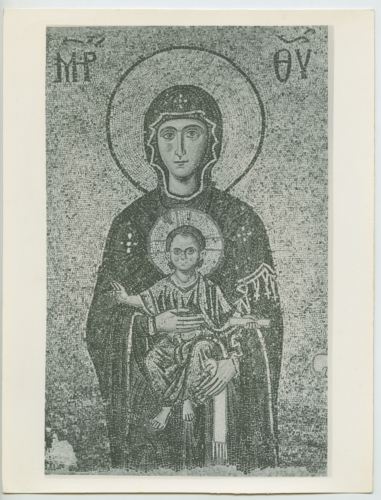 Riproduzione fotografica di una porzione di mosaico che riproduce la Madonna del pannello di Giovanni Comneno, collocato nel matroneo sud della basilica di Santa Sofia a Istanbul.