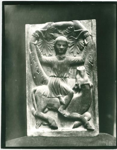 Riproduzione fotografica di una porzione del bassorilievo nella fascia esterna del primo arcone del portale centrale della Basilica di San Marco a Venezia. Nel bassorilievo è rappresentato un uomo su un bue.