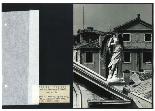 Statua di un Angelo posta a destra del timpano della facciata, con le ali ripristinate dopo il restauro.