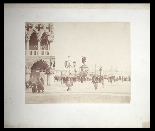 Il servizio fotografico contempla le diverse collocazioni del simulacro del Monumento equestre a Vittorio Emanuele II, a Venezia. In questa fotografia, il soggetto è ripreso davanti al molo di Palazzo Ducale, a Venezia, circondato dai passanti.