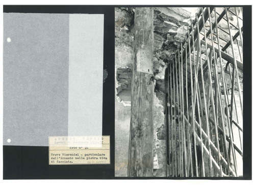 Particolare dell'innesto della trave Vierendeel nella pietra della facciata.