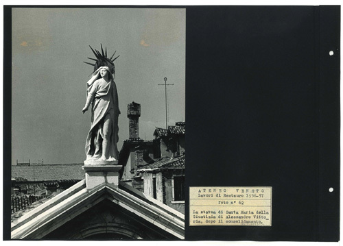 La statua di Santa Maria della Giustizia posta al vertice del timpano della facciata, dopo il restauro.