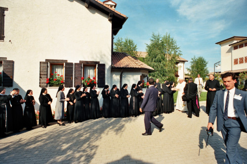 Papa Giovanni Paolo II saluta un gruppo di suore presente in occasione dell'incontro con i fedeli della Diocesi e di Belluno - Feltre