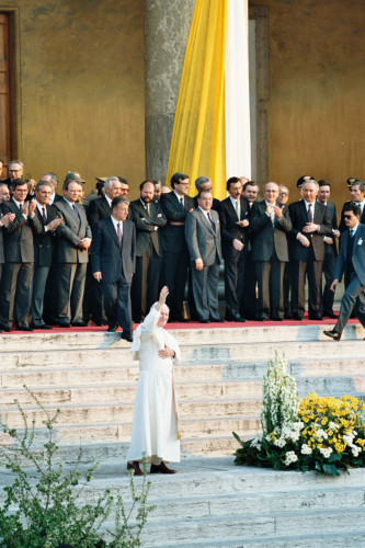 Papa Giovanni Paolo II, saluta il pubblico di fedeli, accanto alle autorità civili riunitisi presso Palazzo Barbieri in occasione della sua visita a Verona;