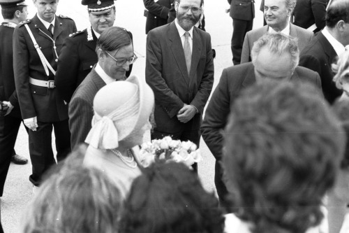 Delegazioni di benvenuto all'aeroporto San Giuseppe di Treviso. La Regina Madre incontra la gente.