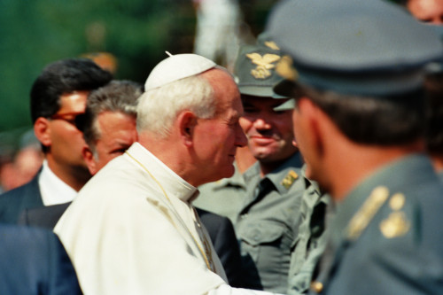 Papa Giovanni Paolo II tra un gruppo del Corpo Forestale dello Stato in occasione del suo incontro con la Diocesi e di Belluno - Feltre