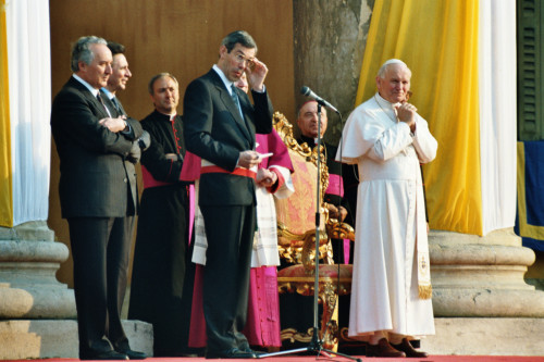 Papa Giovanni Paolo II a Palazzo Barbieri durante la sua visita a Verona; ad accopagnarlo il Presidente della Regione Veneto Carlo Bernini, il Vescovo di Verona Giuseppe Amani, il Sindaco di Verona Gabriele Sboarina e Carlo Fracanzani