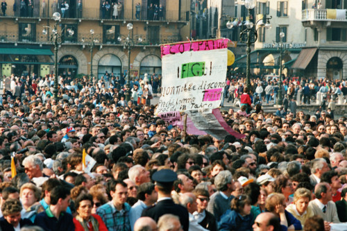 Un manifesto di protesta che dice "E' colpa tua: i figli non ti obbediscono perchè hanno troppi soldi in tasca" mostrato in Piazza Brà in occasione della visita pastolare di Papa Giovanni Paolo II