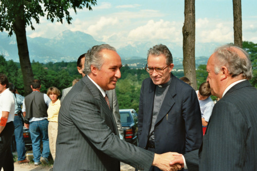 Carlo Bernini, Presidente della Regione Veneto mentre saluta alcuni dei partecipanti all'incontro di Papa Giovanni Paolo II con la Diocesi e di Belluno - Feltre