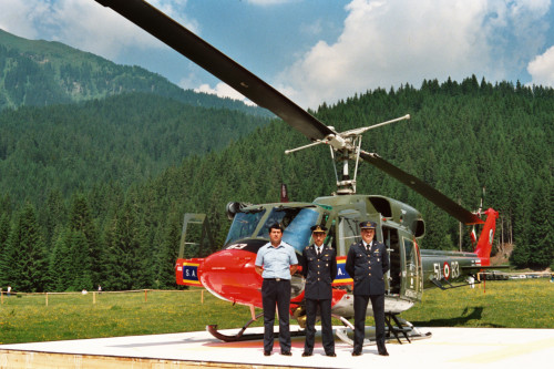 L'elicottero dell'Aeronautica Militare e l'equipaggio impegnato nel trasporto di Papa Giovanni Paolo II dall'Aeroporto militare di Treviso a Lorenzago di Cadore in occasione delle sue vacanze estive