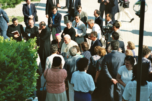 Il sincado di Lorenzago Mario Tremonti e il Vescovo Ducoli Maffeo accompagnano Papa Giovanni Paolo II giunto a Lorenzago di Cadore per trascorrere le vacanze estive; a sinistra il parroco del paese don Sisto Da Prà