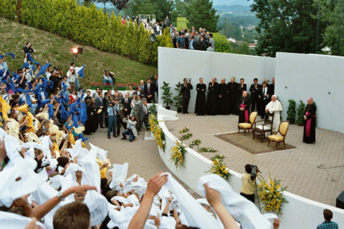 Papa Giovanni Paolo II accompagnato da il Vescovo Ducoli Maffeo (a sinistra) durante l'incontro con i fedeli della Diocesi e di Belluno - Feltre al Centro Papa Luciani