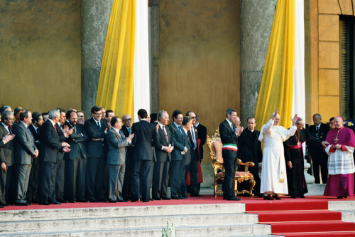 Papa Giovanni Paolo II accanto alle autorità civili riunitisi presso Palazzo Barbieri in occasione della sua visita a Verona;
