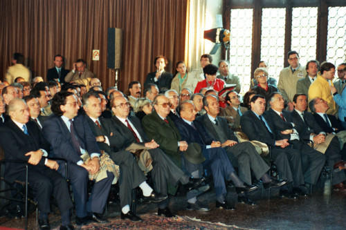 Il pubblico durante l'intervento di Nereo Laroni, Sindaco di Venezia, nella sala dello scrutinio in Palazzo Ducale per la celebrazione del ventennale dell'alluvione che colpì Venezia il 4 novembre del 1966