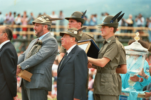 Alcuni Alpini in fila per la benedizione di Papa Karol Wojtyla durante il suo incontro con la diocesi di Belluno - Feltre a Col Cumano