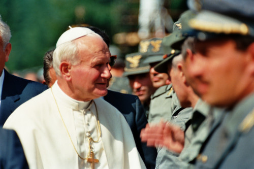 Papa Giovanni Paolo II tra un gruppo del Corpo Forestale dello Stato in occasione del suo incontro con la Diocesi e di Belluno - Feltre