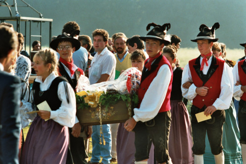 Gruppo folkloristico locale si prepara all'arrivo di Papa Giovanni Paolo II in occasione del suo incontro con la Diocesi e di Belluno - Feltre