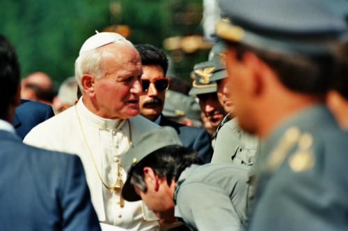 Papa Giovanni Paolo II tra un gruppo del Corpo Forestale dello Stato in occasione del suo incontro con la Diocesi e di Belluno - Feltre