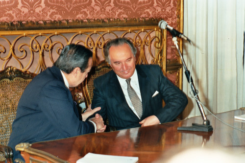 Il Presidente della Repubblica Argentina Raùl Ricardo Alfonsin (a sinistra)in visita a Venezia nel 1987, al termine dell'intervento di Carlo Bernini Presidente della Regione Veneto (a destra)