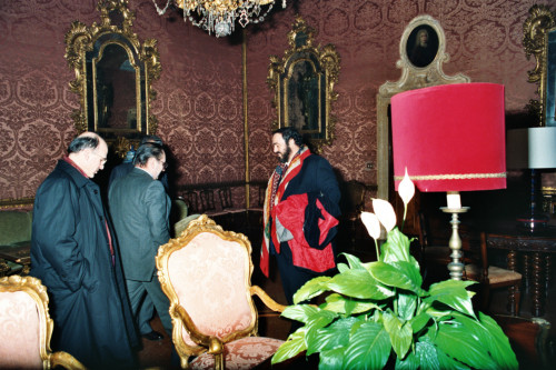 Luciano Pavarotti fotografato all'interno di una sala di Palazzo Balbi