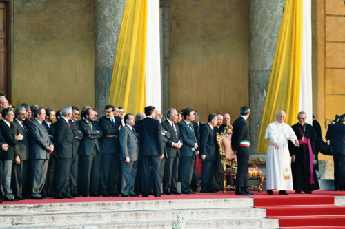 Papa Giovanni Paolo II accanto alle autorità civili riunitisi presso Palazzo Barbieri in occasione della sua visita a Verona;