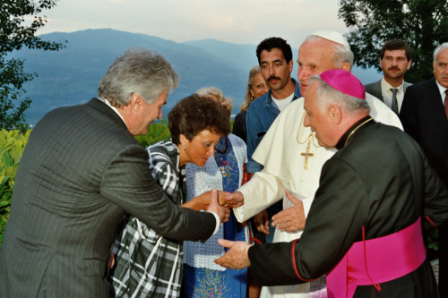 Papa Giovanni Paolo II accompagnato da il Vescovo Ducoli Maffeo (a destra) durante l'incontro con i fedeli della Diocesi e di Belluno - Feltre
