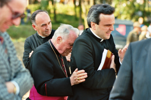 Il Vescovo Ducoli Maffeo si ripara dietro le spalle del fututo monsignore Giorgio Lise durante l'arrivo di Papa Giovanni Paolo II in elicottero, in occasione del suo incontro con la comunità di fedeli della Diocesi e di Belluno - Feltre