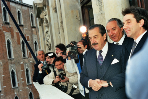 Il Presidente della Repubblica Argentina Raùl Ricardo Alfonsin (al centro)in visita a Venezia nel 1987, mentre si affaccia dal terrazzino di Palazzo Balbi accompagnato da Carlo Bernini Presidente della Regione Veneto (alle sue spalle) e Umberto Carraro (alla sua sinistra)
