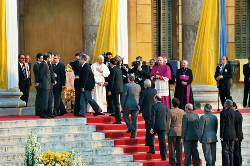 Papa Giovanni Paolo II saluta le autorità civili riunitisi presso Palazzo Barbieri in occasione della sua visita a Verona;