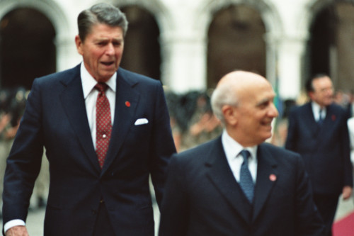 Servizio fotografico ripreso durante l'arrivo di Ronald Reagan, presso Palazzo Ducale in occasione della sua partecipazione al summit del Gruppo dei Sette, Venezia nel 1987