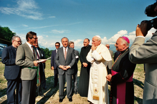 Papa Giovanni Paolo II accompagnato da il Vescovo Ducoli Maffeo (a destra) incontra alcune autorità politiche in occasione dell'incontro con i fedeli della Diocesi e di Belluno - Feltre; tra di loro Carlo Bernini Presidente della Regione Veneto (al centro)