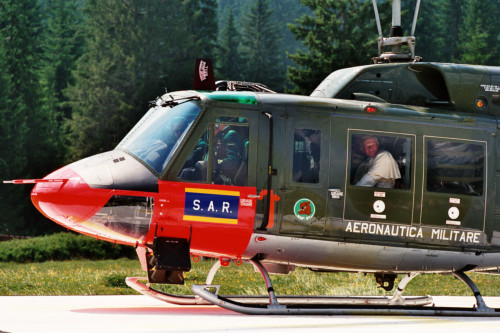 La partenza in elicottero di Papa Giovanni Paolo II da Pramarino in Val Visdende a seguito della sua visita