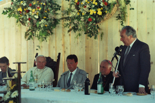 L'intervento di Carlo Bernini durante il pranzo a seguito della celebrazione della Santa Messa di Papa Giovanni Paolo II presso Col Cumano in occasione del suo incontro con la Diocesi e di Belluno - Feltre; alla sua destra il Vescovo di Belluno-Feltre Ducoli Maffeo e Carlo Bernini e il Pontefice