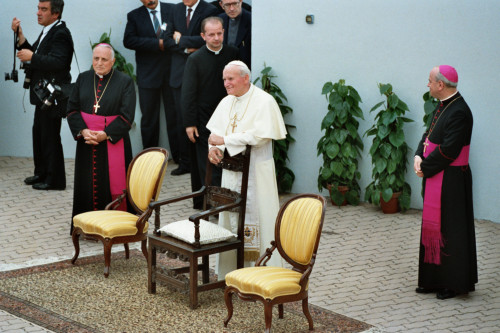 Papa Giovanni Paolo II accompagnato da il Vescovo Ducoli Maffeo (a sinistra) durante l'incontro con i fedeli della Diocesi e di Belluno - Feltre al Centro Papa Luciani