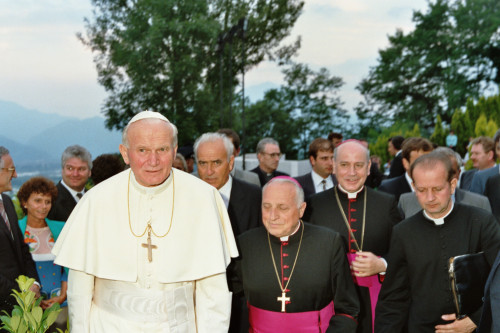 Papa Giovanni Paolo II accompagnato da il Vescovo Ducoli Maffeo (a destra) durante l'incontro con i fedeli della Diocesi e di Belluno - Feltre
