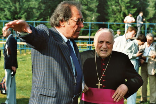 Il Vescovo Ducoli Maffeo (al centro) discute sull'organizzazione dell'arrivo di Papa Giovanni Paolo II presso Col Cumano in occasione della visita alla Diocesi e di Belluno - Feltre