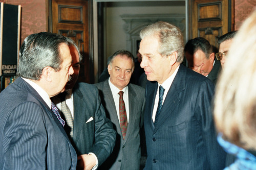 Il Presidente della Repubblica Argentina Raùl Ricardo Alfonsin (a sinistra)in visita a Venezia nel 1987, mentre saluta gli esponenti politici presenti durante il suo intervento a Palazzo Balbi