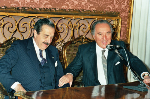 Il Presidente della Repubblica Argentina Raùl Ricardo Alfonsin (a sinistra)in visita a Venezia nel 1987, al termine dell'intervento di Carlo Bernini Presidente della Regione Veneto (a destra)