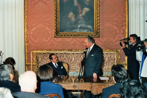Il Presidente della Repubblica Argentina Raùl Ricardo Alfonsin (a sinistra)in visita a Venezia nel 1987, durante dell'intervento di Carlo Bernini Presidente della Regione Veneto (a destra)