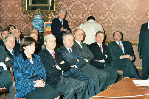 Gli esponenti politici presenti durante dell'intervento di Carlo Bernini Presidente della Regione Veneto in occasione della visita del Presidente della Repubblica Argentina Raùl Ricardo Alfonsin a Venezia nel 1987. Tra questi riconosciamo Amalia Sartori allora presidente dell'aeroporto Marco Polo di Venezia