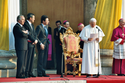 L'intervento di Papa Giovanni Paolo II in occasione della sua visita alla città di Verona; tra le autorità presenti ricordiamo Carlo Bernini Presidente della Regione Veneto, il Vescovo di Verona Giuseppe Amani, il sindaco della città Gabiele Sboarina e Carlo Fracanzani