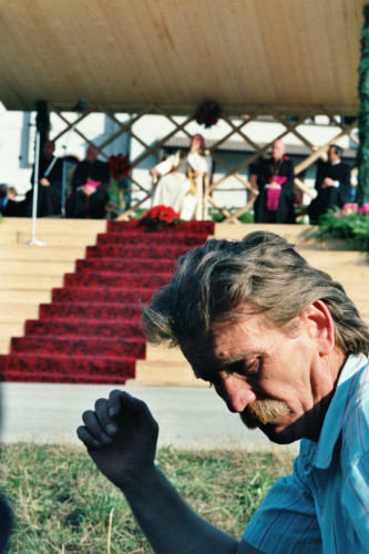 Papa Karol Wojtyla in occasione dell'incontro con la diocesi di Belluno - Feltre a Col Cumano; in primo piano una persona del pubblico