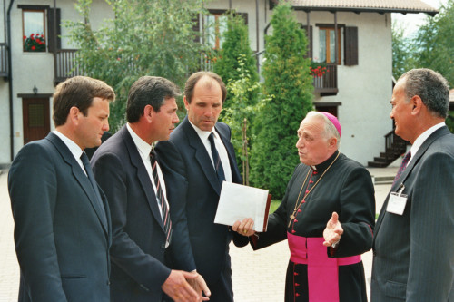 Vescovo Ducoli Maffeo presso il Centro Papa Luciani a Santa Giustina, organizza con alcune persone la visita di Papa Giovanni Paolo II