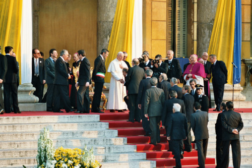 Papa Giovanni Paolo II saluta le autorità civili riunitisi presso Palazzo Barbieri in occasione della sua visita a Verona;