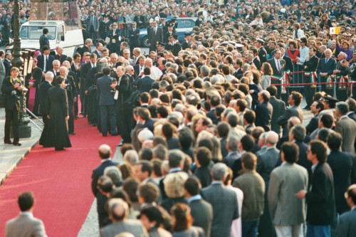 Giovanni Paolo II accompagnato dal Vescovo di Verona Giuseppe Amani tra il pubblico di fedeli riuniti in Piazza Brà in occasione della sua visita pastorale a Verona; tra le autorità civili presenti il Presidente della Regione Veneto Carlo Bernini, il sindaco di Verona Gabriele Sboarina e Carlo Fracanzani