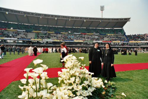 Due suore tra il pubblico di fedeli riunito presso lo stadio Bentegodi di Verona in occasione della sua visita pastorale di Papa Giovanni Paolo II