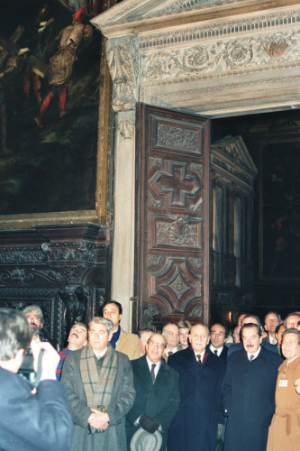 Il Presidente della Repubblica Argentina (il primo da destra)Raùl Ricardo Alfonsin a Venezia nel 1987, in visita la Basilica di Santa Maria Gloriosa dei Frari