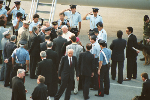 Papa Giovanni Paolo II all'imbarco del jet diretto a Roma al termine delle sue vacanze estive trascorse in Cadore