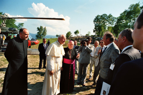 Papa Giovanni Paolo II accompagnato da il Vescovo Ducoli Maffeo (a destra) incontra alcune autorità politiche in occasione dell'incontro con i fedeli della Diocesi e di Belluno - Feltre