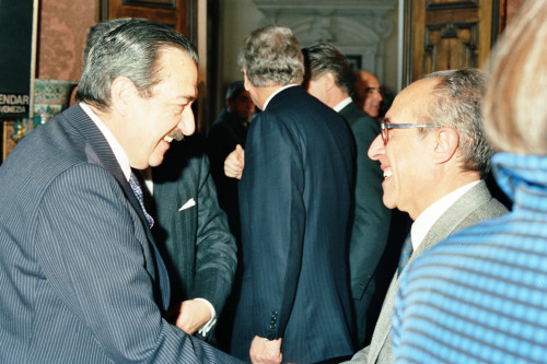Il Presidente della Repubblica Argentina Raùl Ricardo Alfonsin (a sinistra)in visita a Venezia nel 1987, mentre saluta gli esponenti politici presenti durante il suo intervento a Palazzo Balbi
